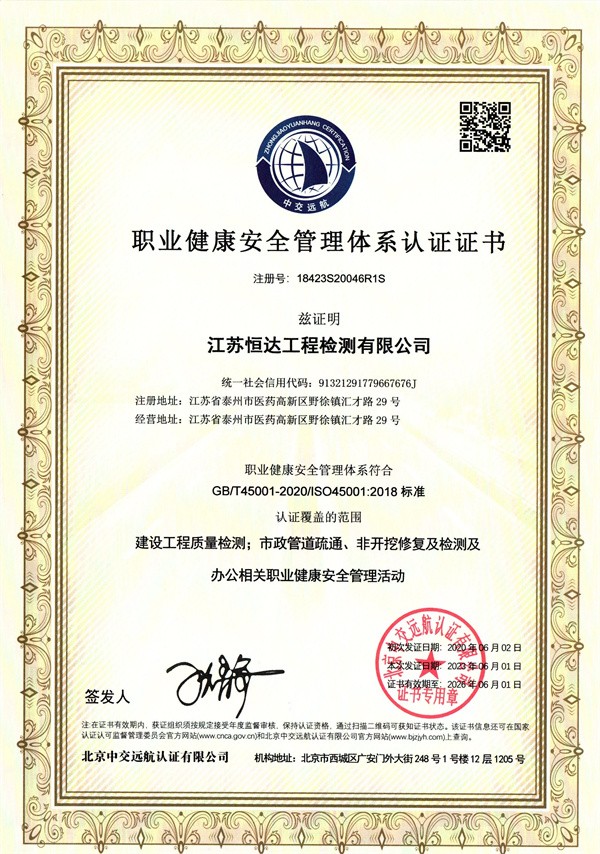 公司自2005年成立以來,建立了完善的質量管理體系。先后通過國家認可委國家實驗室CNAS認可,國家質量監督檢驗檢疫總局無損檢測機構資質認可,江蘇省住建廳、江蘇省質量技術監督局計量CMA認證;被江蘇省施工企業管理委員會評為江蘇省質量服務信譽AAA先進單位、被江蘇省工程質量監督辦公室授予為江蘇省重質量守信譽誠信檢測單位,是一家具有獨立法人資格的第三方公正檢測機構。
